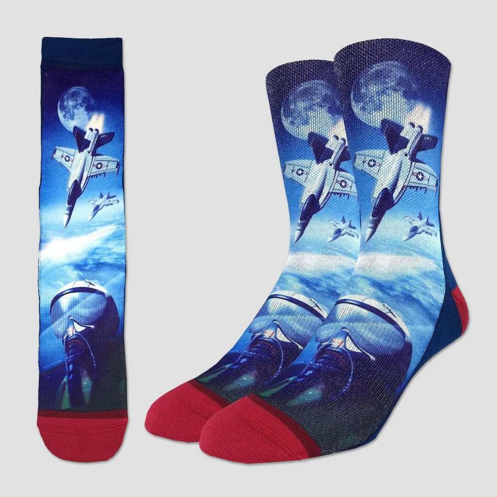 Bright blue socks that hit the mid calf and feature the F-18 fighter jet and its pilot.