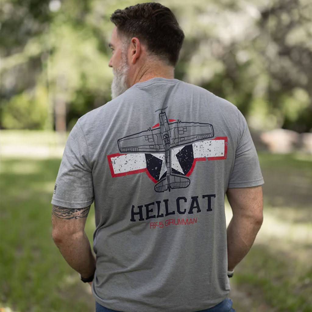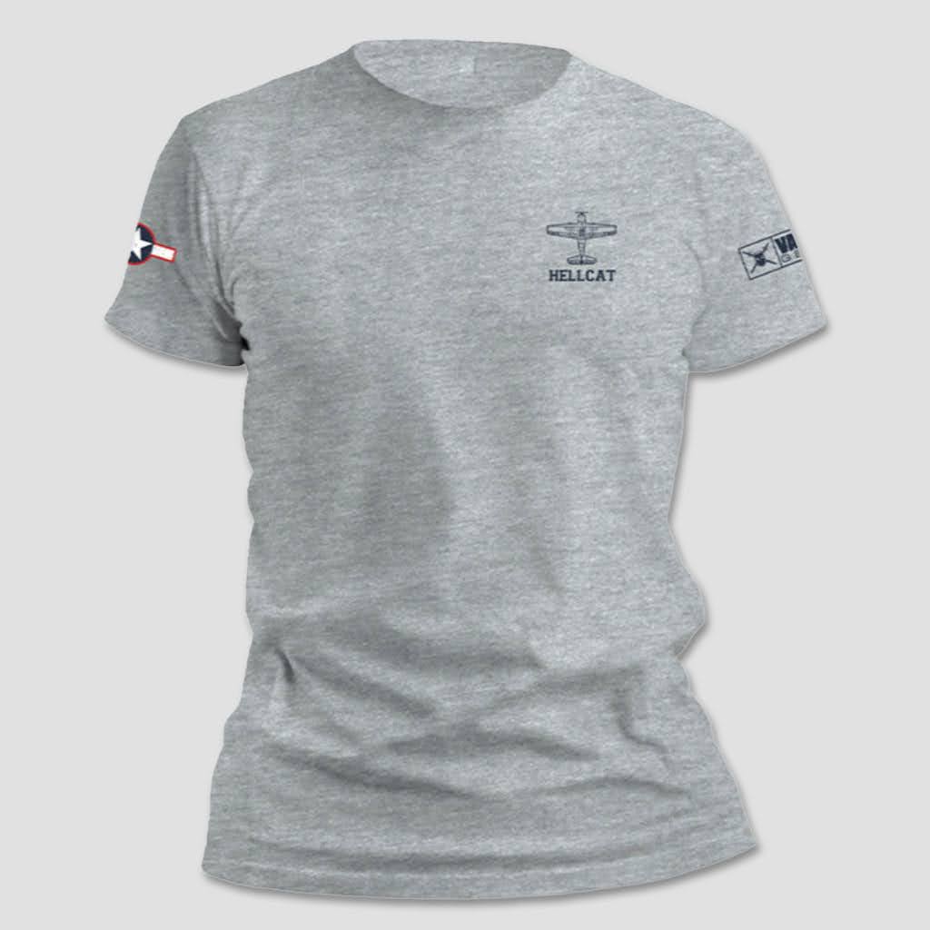 A part of our new Blueprints Collection, this soft gray t-shirt features the iconic F6F Hellcat! The F6F made its combat debut in 1943, and became the Navy's dominant fighter plane in the second half of World War II.