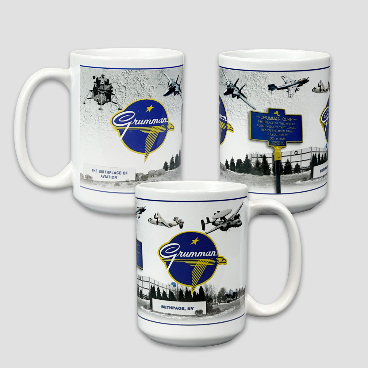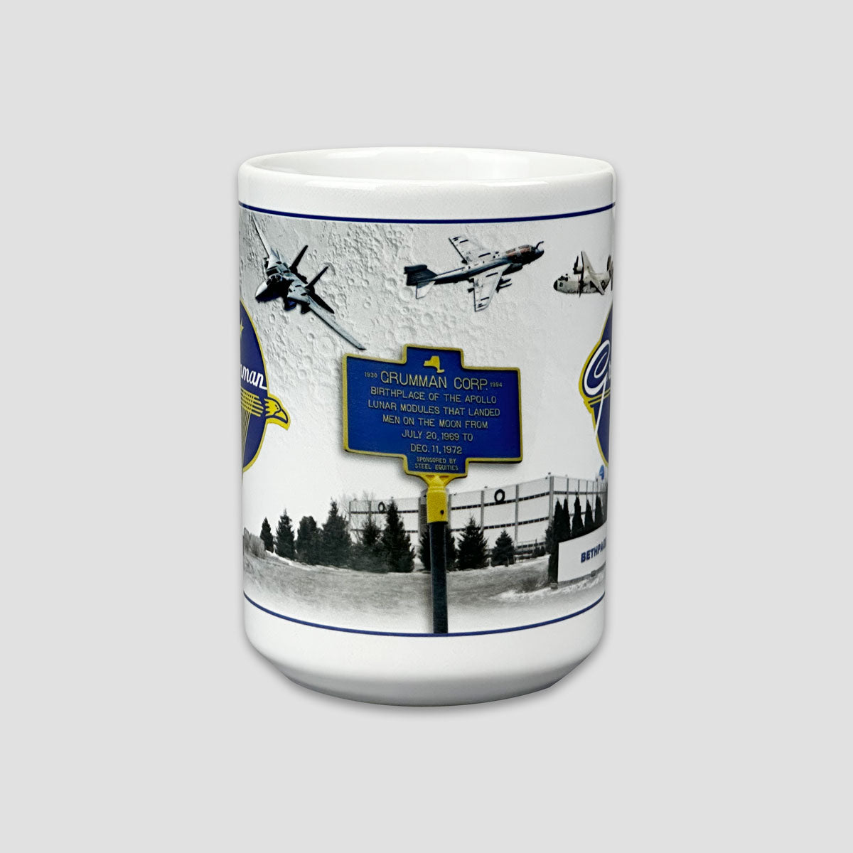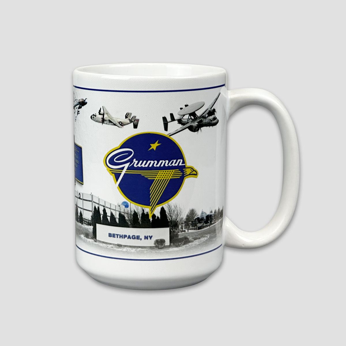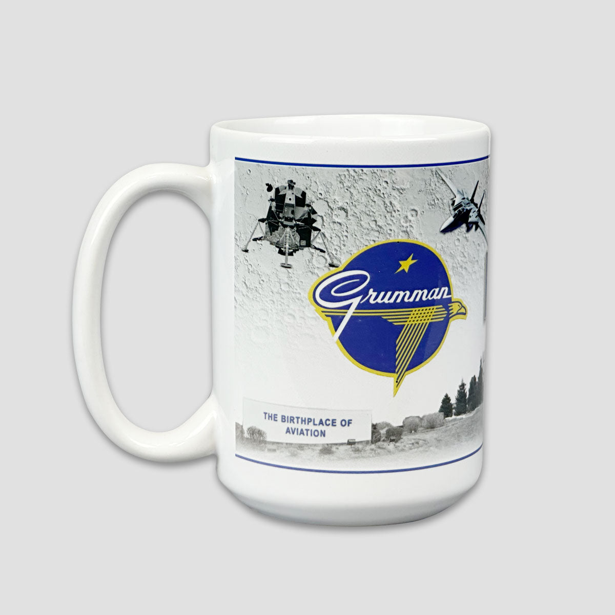 Ceramic 15oz mug with a collage design of the Grumman logo and other Grumman symbols!