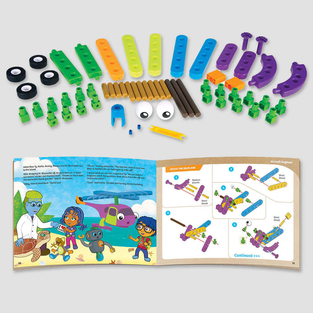 This 73-piece science kit combined with the beautifully illustrated 32-page storybook provides an engaging way to teach simple engineering concepts to preschool-age kids. Start laying the groundwork for strong STEM related skills and comprehension. This kit helps develop fine motor skills, science and math skills, visual-spatial skills, and reasoning and concept development skills.