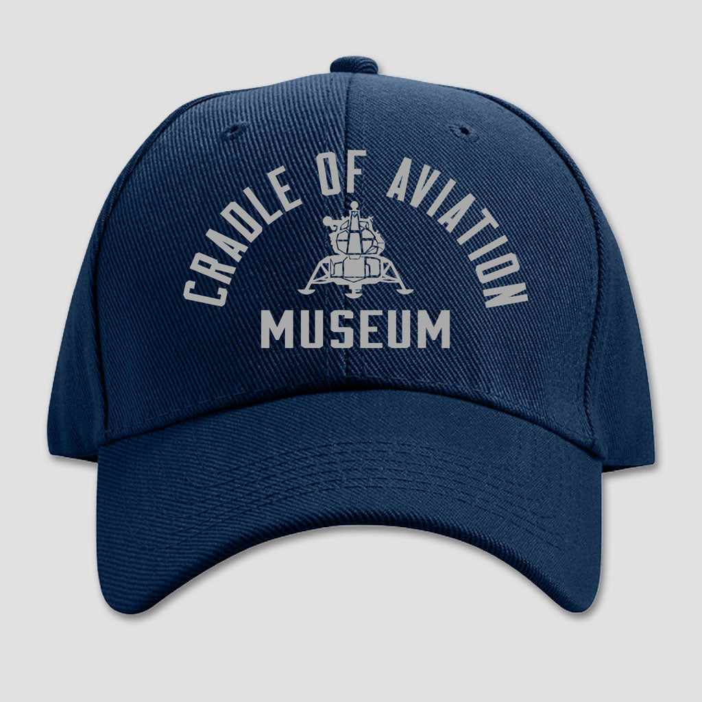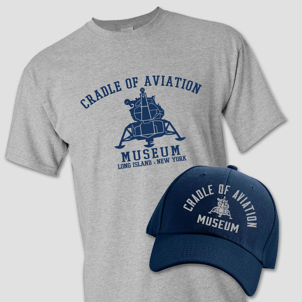 New hat & tee combo alert! With this fresh new design, you can show off your love for space and rep the Cradle's very own Lunar Module! This combo includes a light grey t-shirt with a navy design and a matching navy hat with white embroidery.