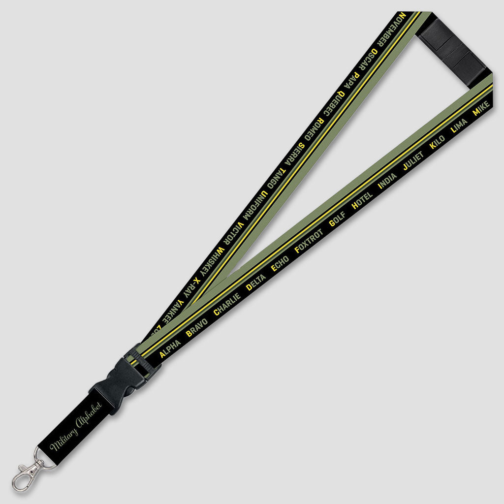Learn the alphabet that the military uses to communicate clearly when spelling out words while keeping your keys or id badges securely in place! This 22" lanyard has full color printing on both sides, as well as a detachable buckle and clip for easy access to your items.