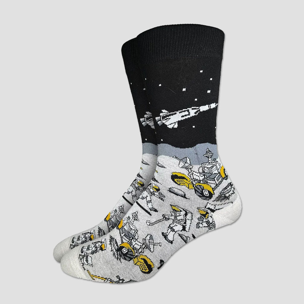 Crew socks with a detailed scene of astronauts exploring the moon!