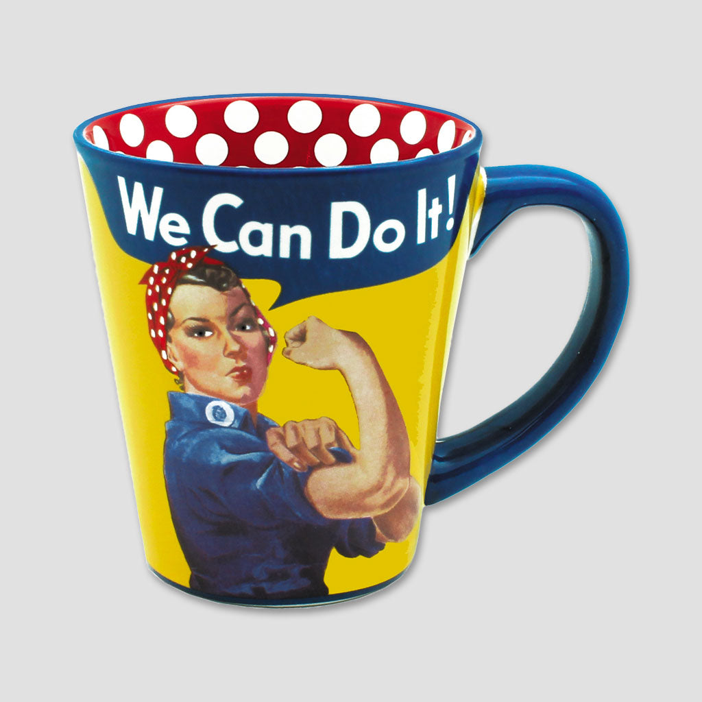 This mug has an all around design with the iconic "We Can Do It!" poster and a red and white polka dot pattern on the inside.